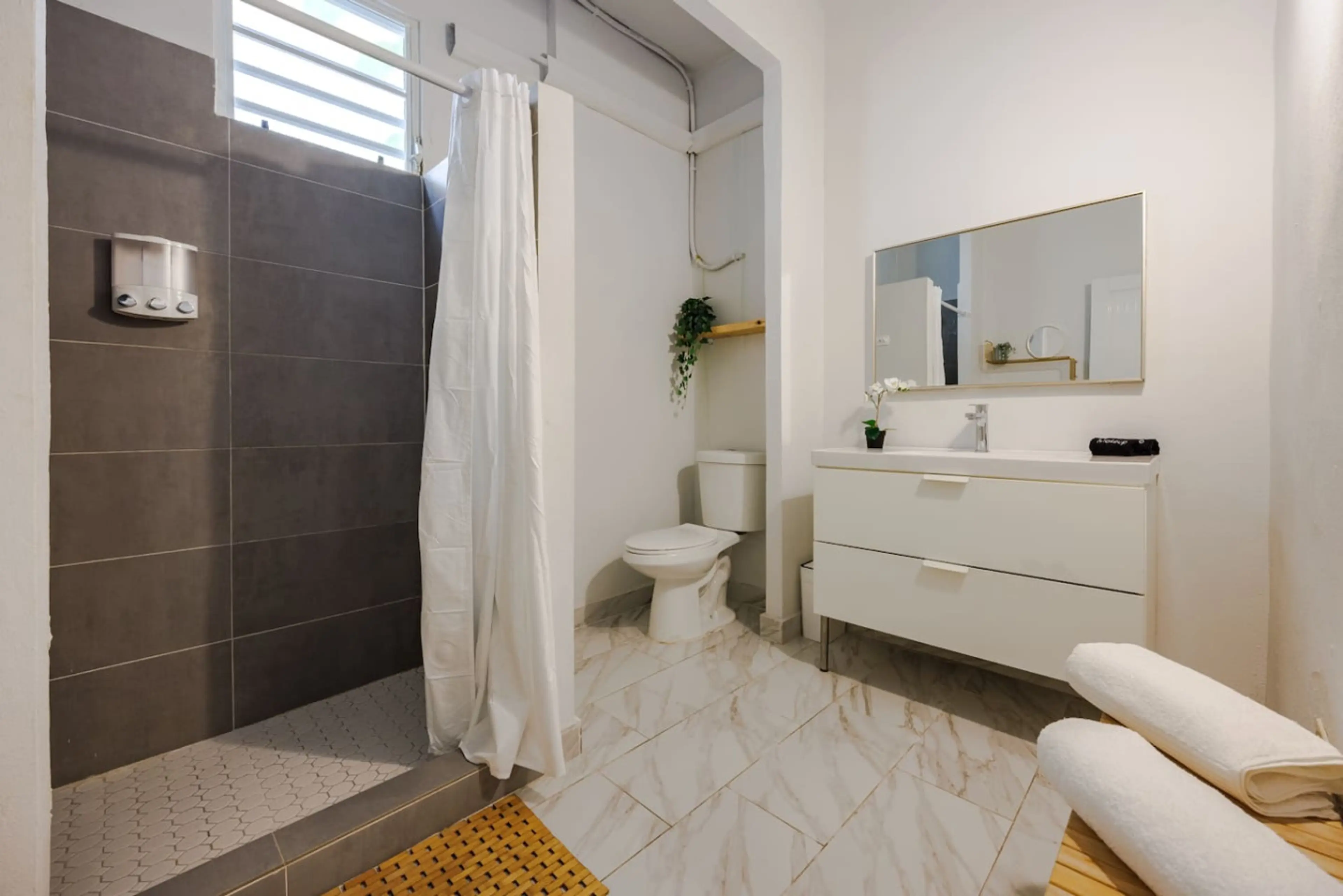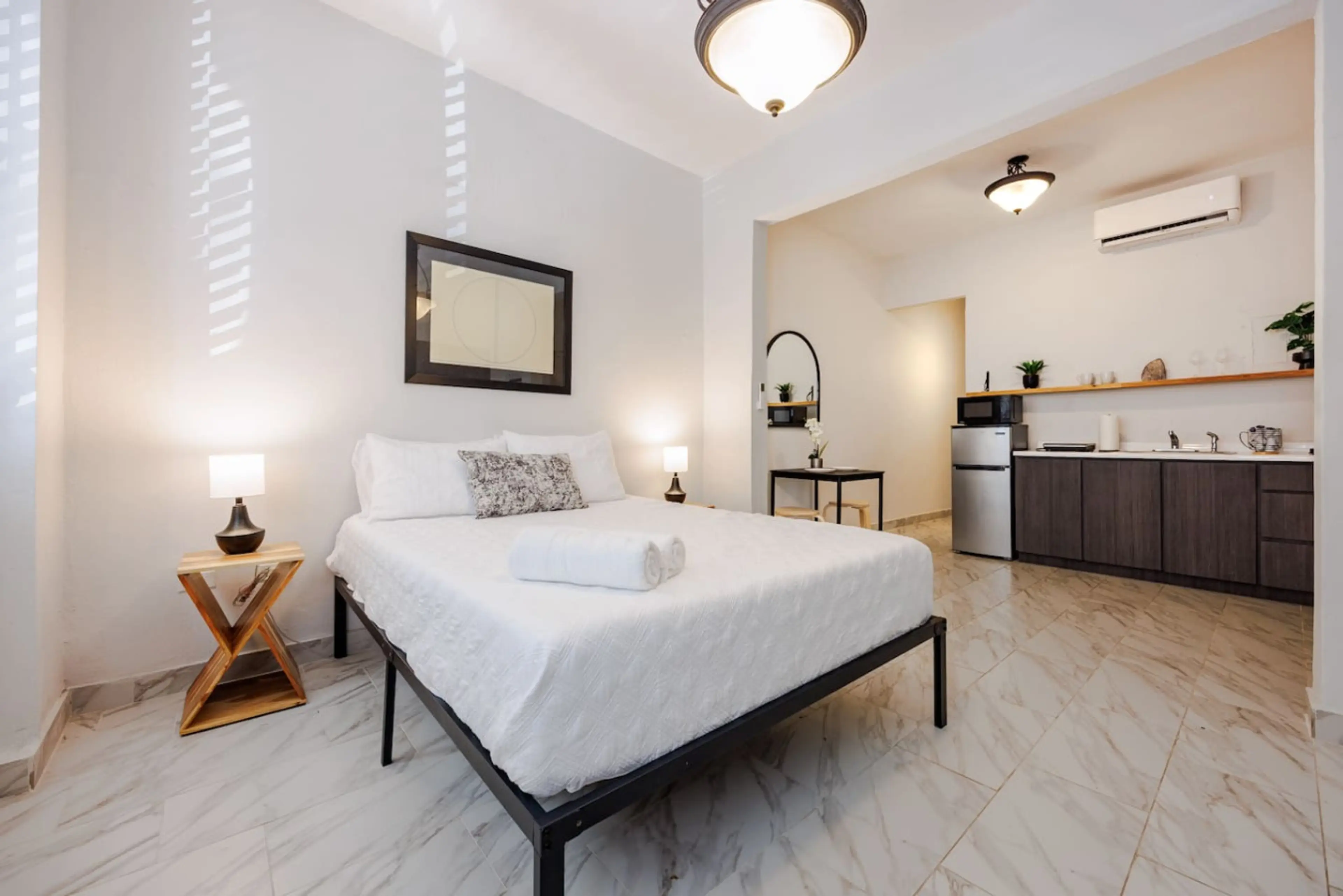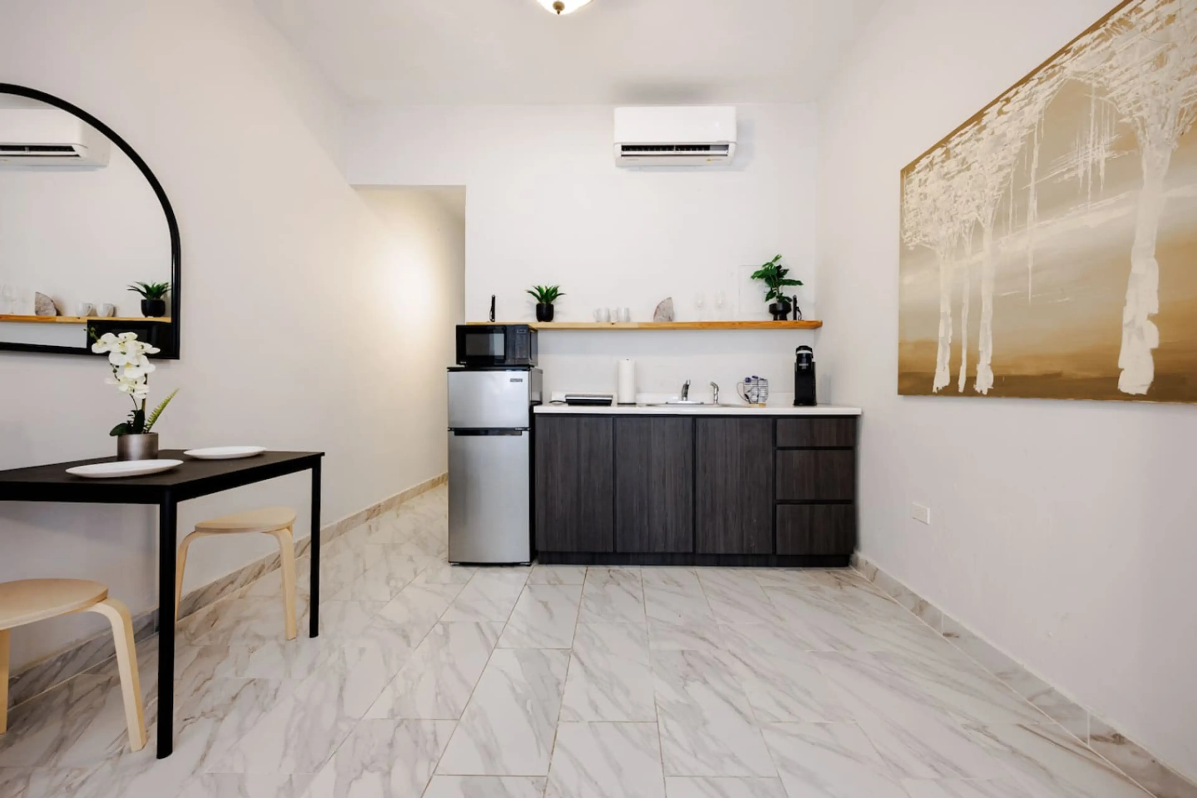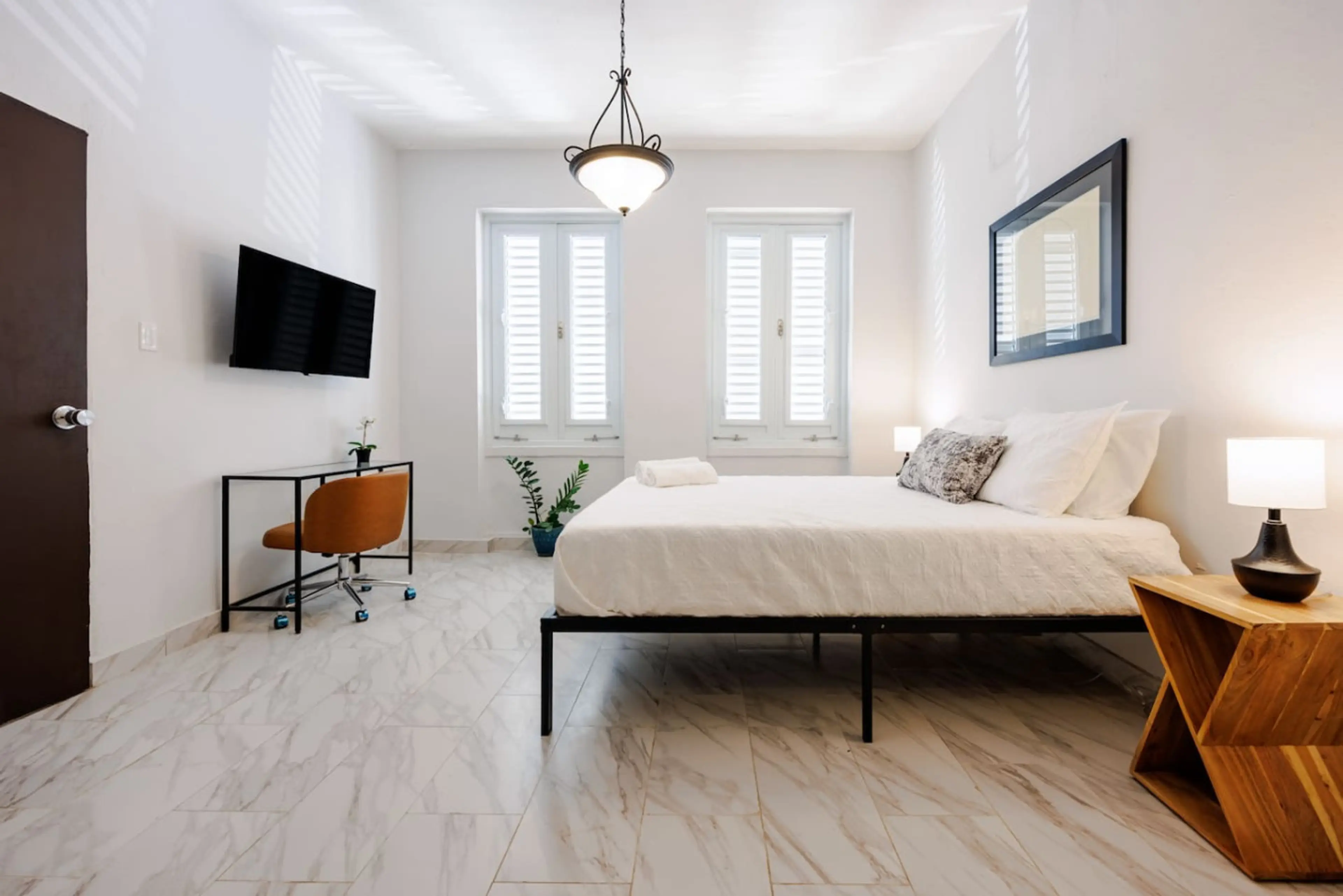 Unwind in this bright, modern studio located between Old San Juan and Condado. The space features a cozy queen bed, dining nook, and kitchenette with everything you need for a short or extended stay. Enjoy free street parking, keyless entry, and flexible check-in. Steps from beaches, cafés, and hist...